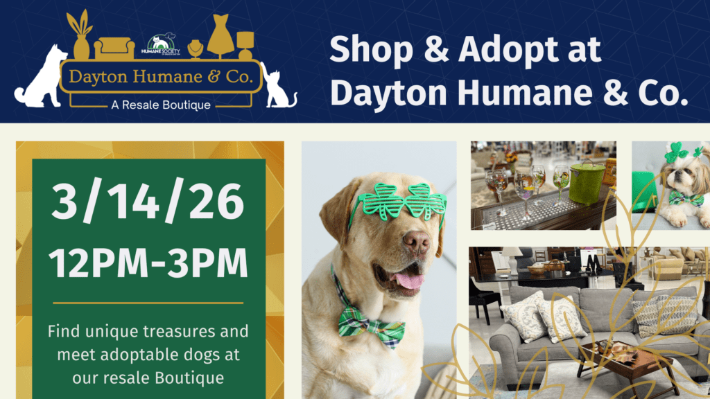 Give a homeless pet their lucky day! Dayton Humane & Co. will be hosting adoptable dogs on Saturday, March 14th from 12pm-3pm. You can also browse our merchandise, knowing that all proceeds directly support the animals at the Humane Society of Greater Dayton.